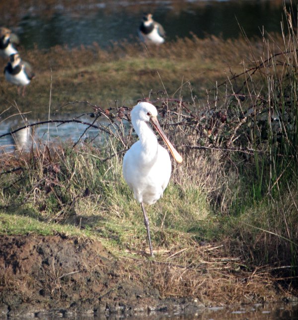 We didn't really have a plan for today except that Badger, my birding chum from Oxon and partner in crime for the running of the Oxon Birding Blog, was down in Kernow with his VLW and we'd made a tentative arrangement to meet up at the Hayle estuary. Once my VLW was awake I checked that this was OK with her and having been given the green light, I hastily got ready and set off for our 10 a.m. rendezvous at Hayle. The weather was absolutely gorgeous down by the estuary with bright sunshine and very little wind. We started off at Ryan's Field where the long-staying Spoonbill was tucked up asleep though he did lift his head once long enough for me to take his photo.